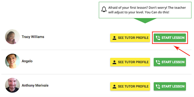 The last step is to click on the "start lesson" button. It is that simple! In the meantime, you will be able to choose the subject of the lesson. After a few seconds you will be connected with your tutor and the conversation will start.